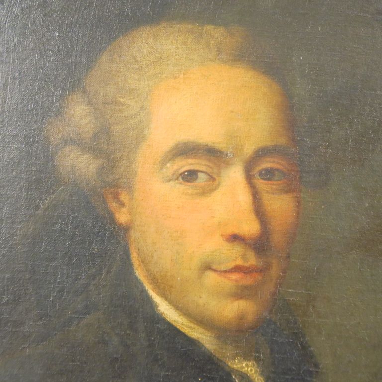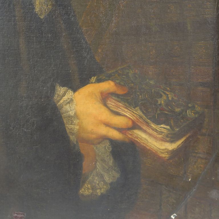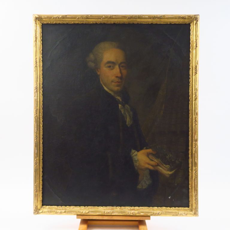 Ecole française XVIIIème. "Portrait d'homme aux livres". Huile sur toile, anciennement en médaillon. Dim. : 79 x 62 cm (restaurée, réentoilée)