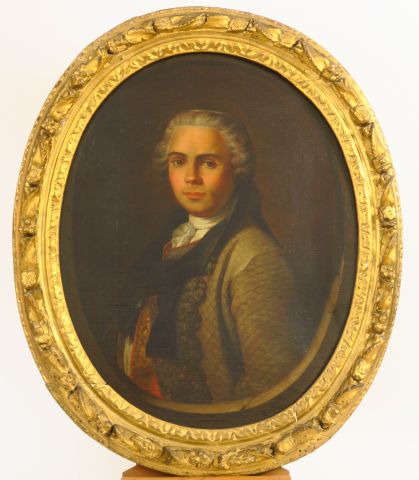 Ecole Française XVIIIème. 'Portrait d'homme en habit'. Huile sur toile dans un cadre médaillon en bois sculpté et doré. Dim. 71 x 60 cm.