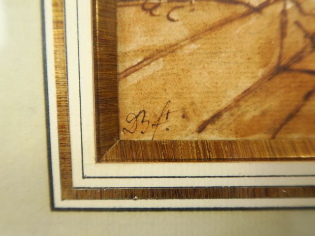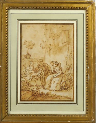 Ecole française XVIIIème "Réunion de famille dans un parc" Dessin au lavis monogrammé en bas à gauche DF Dim. 26 x 18 cm