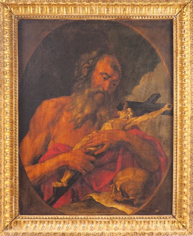 Ecole française XVIIIème. "Saint Jérôme" Huile sur toile dans un cadre Louis XVI en bois sculpté et doré. Dim. 90 x 71 cm.