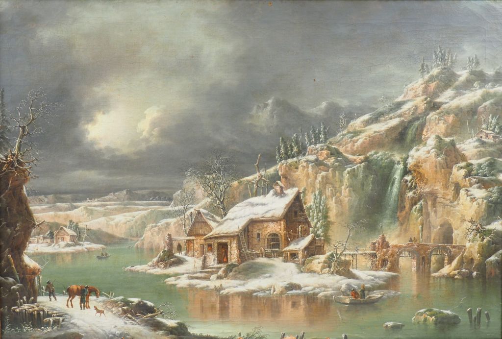 Ecole italienne fin XVIIIème - début XIXème. 'Paysage de neige'. Huile sur toile. Dim. : 63 x 93,5 cm.