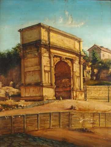 Ecole italienne XIXe, "Vue du Forum". Huile sur carton. 64 x 53,5 cm