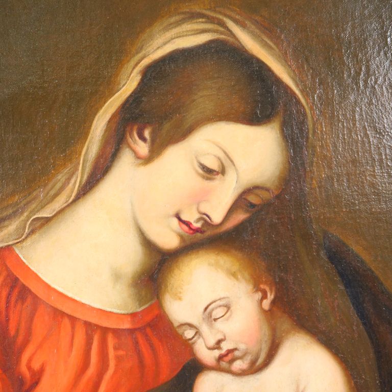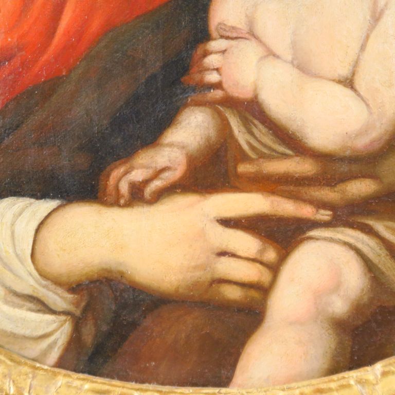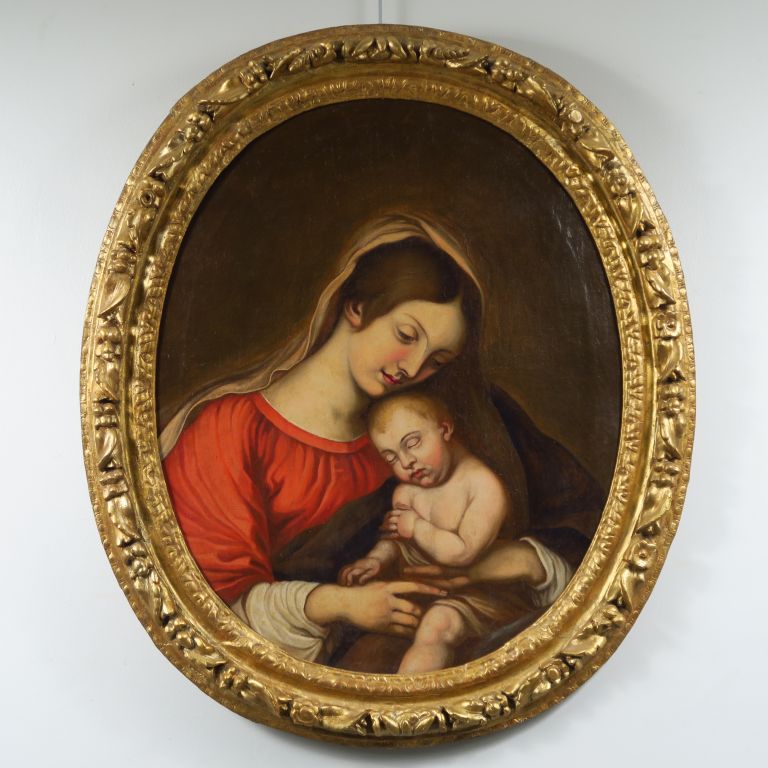 Ecole italienne XIXème. "Vierge à l'enfant". Huile sur toile dans son cadre XVIIIème en bois sculpté et doré en médaillon. Dim. : 73 x 60 cm. (réentoilée)