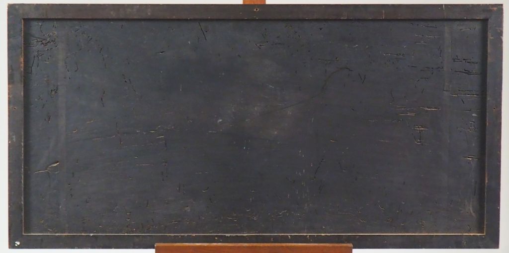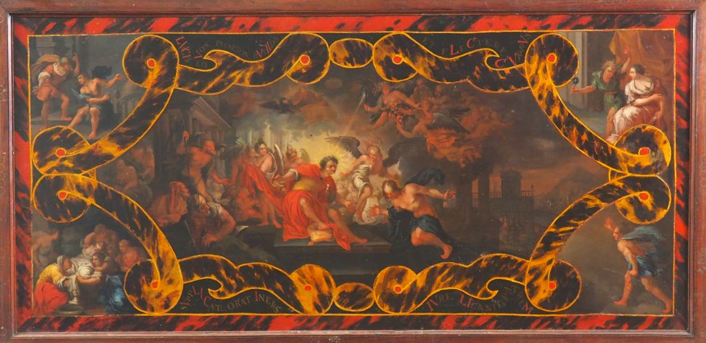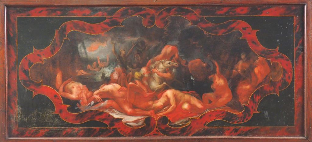 Ecole VENITIENNE vers 1680, entourage de Giulio Carpioni "Le déluge, les dieux de l'Olympe" Paire de panneaux, les compositions inscrites dans un entourage peint à la manière de l'écaille Hauteur : 62.5 cm Largeur : 134.5 cm le deuxième 58.5 x 134 inscriptions dans des phylactères encadrant les compositions.les tableaux sont de deux mains différentes. Expert : Cabinet Turquin - Stéphane Pinta.