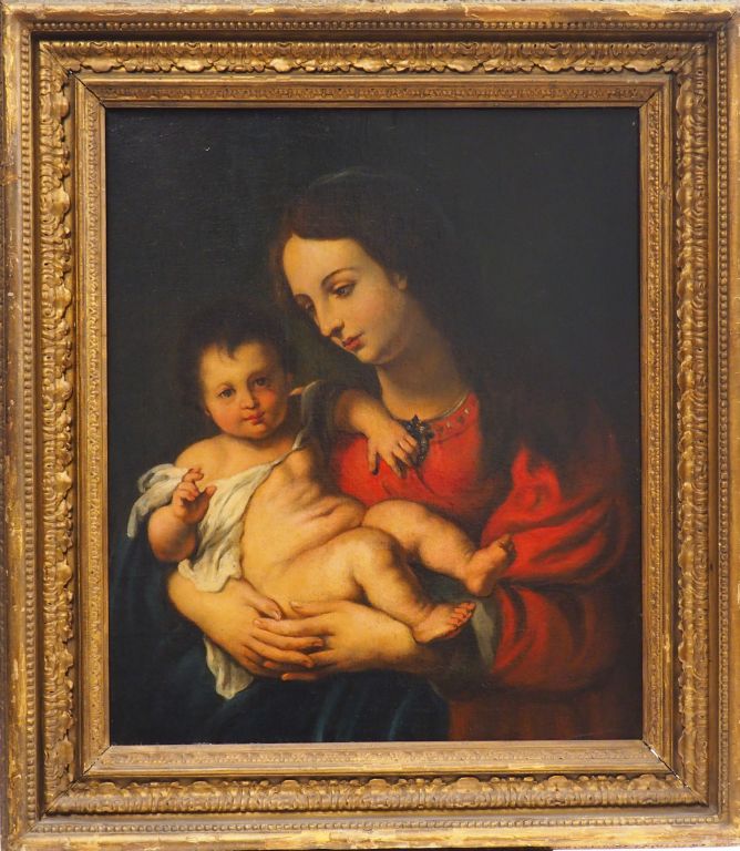 Ecole XVIIème, dans le goût de Van Dyck. "Vierge à l’Enfant". Huile sur toile. Dim. : 63 x 52 cm (rentoilée, restaurée) Expert : Cabinet Turquin