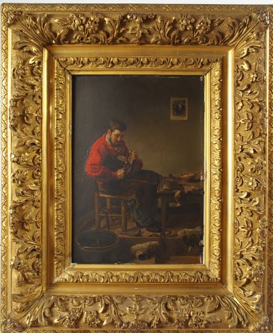 F. BONVIN 'Le sabotier'. Huile sur panneau signée en bas à droite et datée. Dans un cadre en bois et stuc doré. 41 x 29 cm (petits sauts de peinture au niveau du cadre)