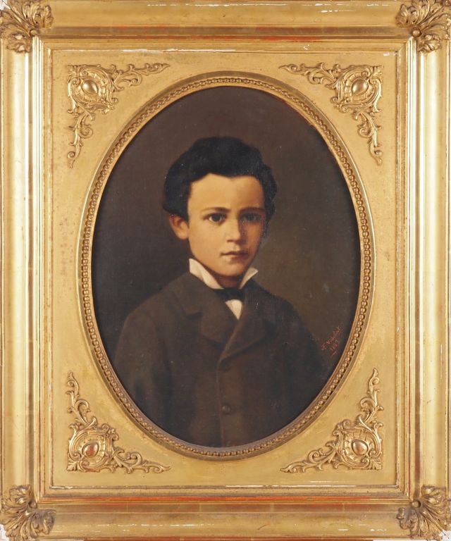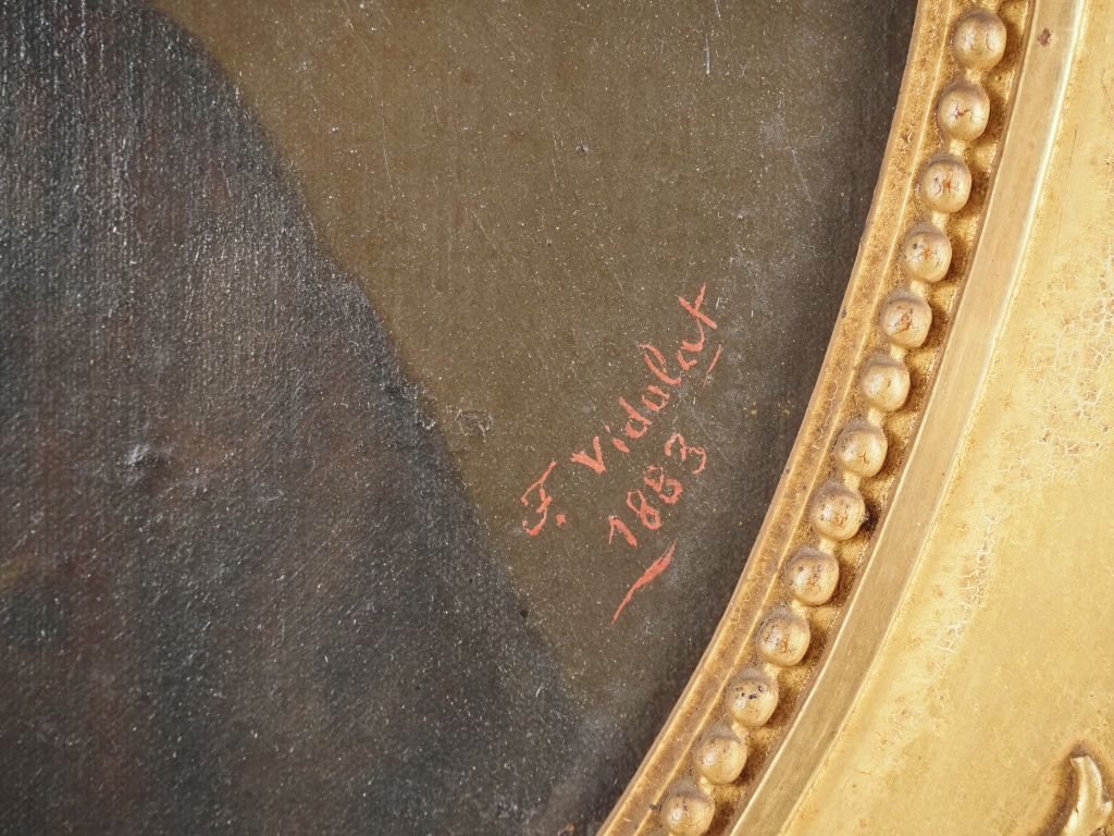 F. VIDALAT. "portrait de jeune garçon" Huile sur toile, signée en bas à droite et datée 1883 dans son cadre médaillon en stuc Dim. À vue : 39,5 x 30 cm