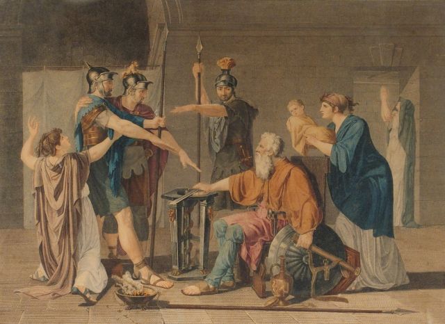 Gravure XIXe en couleur "Le serment des Horaces", dans son cadre de style Louis XVI en bois doré. Dim. Avec le cadre : 60,5 x 74 cm