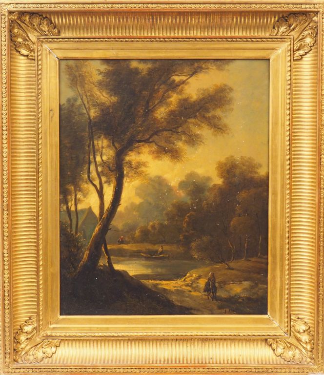 J. ANDRE. 'Paysage lacustre animé'. Huile sur toile, signée en bas à droite. Dim. : 46 x 37,5 cm. (petits accidents)