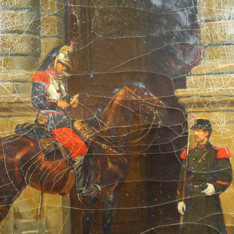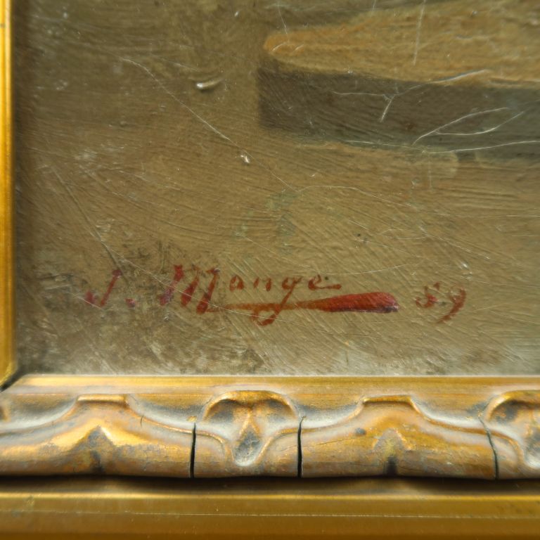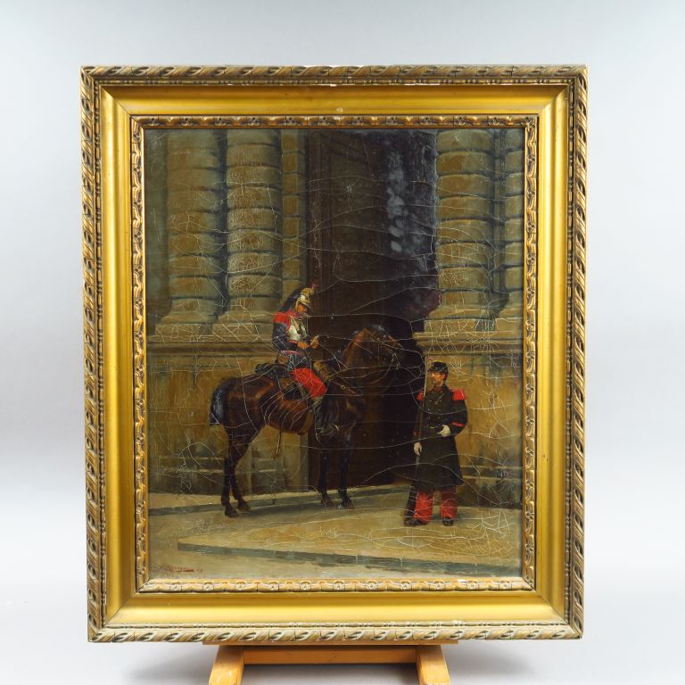 J. MONGE. "Le passage du Louvre". Huile sur toile, signée en bas à gauche et datée. Dim. 57 x 48 cm. (craquelures)