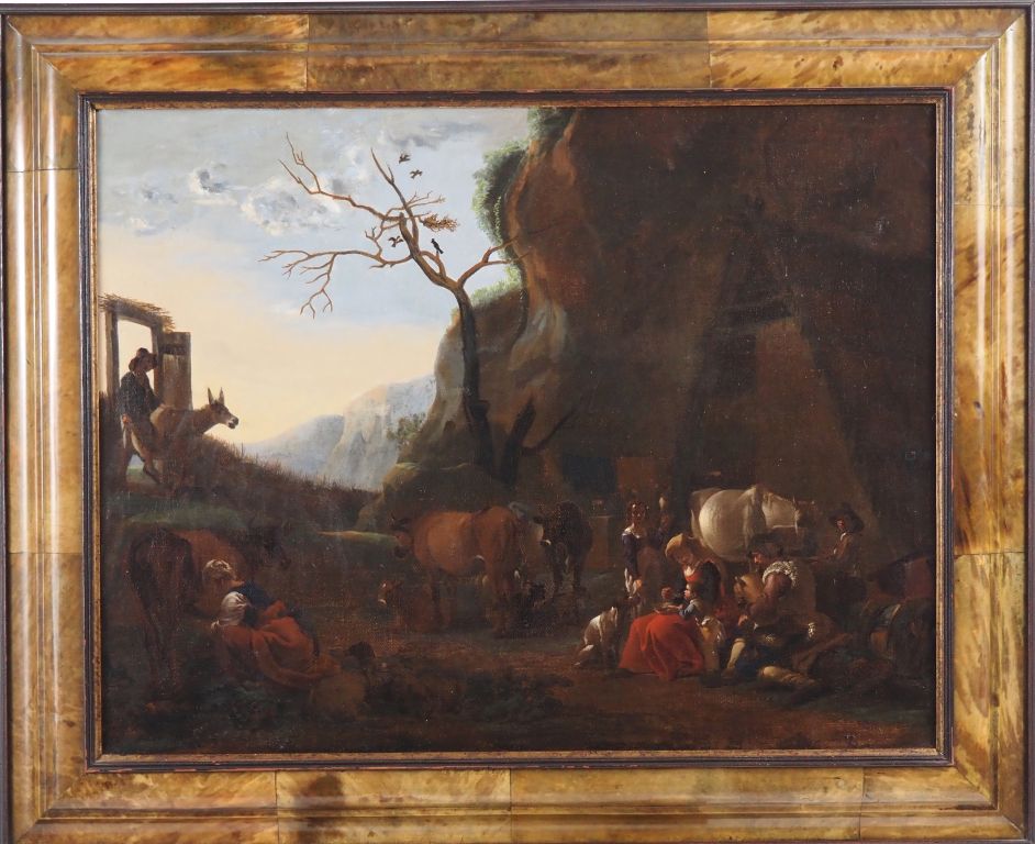 Jan MIEL (Attribué à) "Scène paysanne devant une ferme". Huile sur toile. Dim. 51 x 67 cm. (petites restaurations, réentoilé).