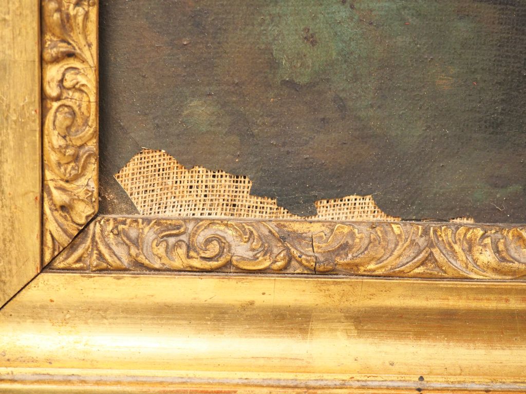 Lucien MENGAUD. "Bergères et leur troupeau". Huile sur toile, signée et datée 1853. Dim. 38 x 46 cm. (Sauts de peintures).