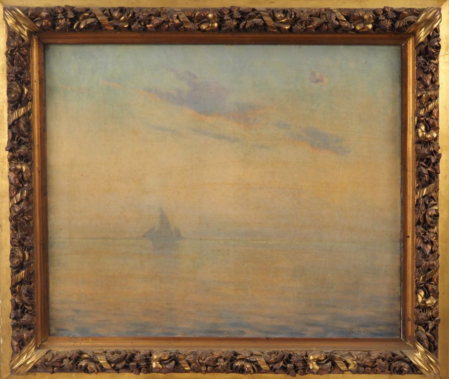 M. ORLIAC. "Marine au soleil levant" Huile sur toile, signée en bas à droite. Dim. 54,5 x 65,5 cm Dans son joli cadre en bois et stuc doré