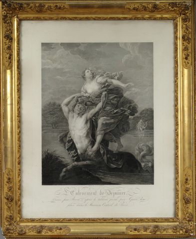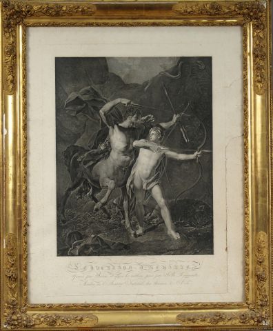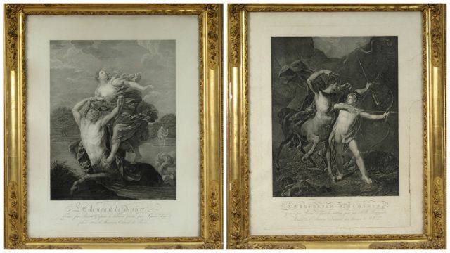 Paire de gravures en noir XIXe "L'enlèvement de Déjanire" et "L'éducation d'Achille". Dans leurs cadres d'origine en bois et stuc doré.