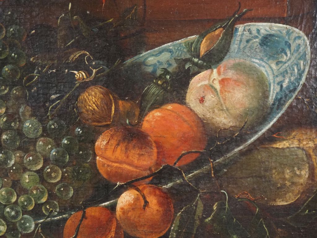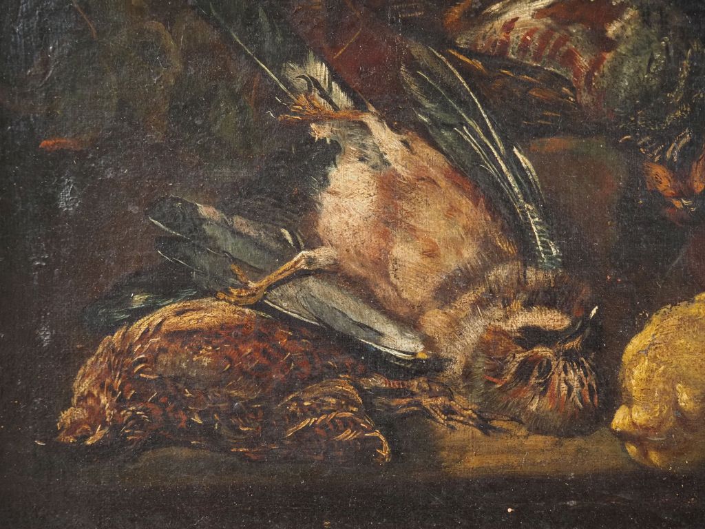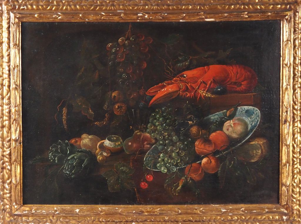 Paire d'Ecoles françaises dans le goût des Ecoles flamandes XVIIème. "Nature morte aux crustacés" et "nature morte au singe". Paire d'huiles sur toiles. Dim. 55 x 77 cm.