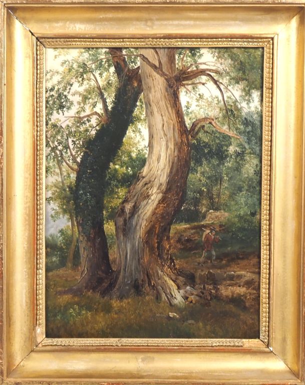 Paul HUET (1803 - 1869) Promeneur dans un sous bois Papier marouflé sur toile (cachet de Moyon) Hauteur : 33,7 cm Largeur : 25,5 cm Cachet de l'atelier en bas à droite Au dos une etiquette avec le n°90. Expert : Cabinet Turquin - Stéphane Pinta
