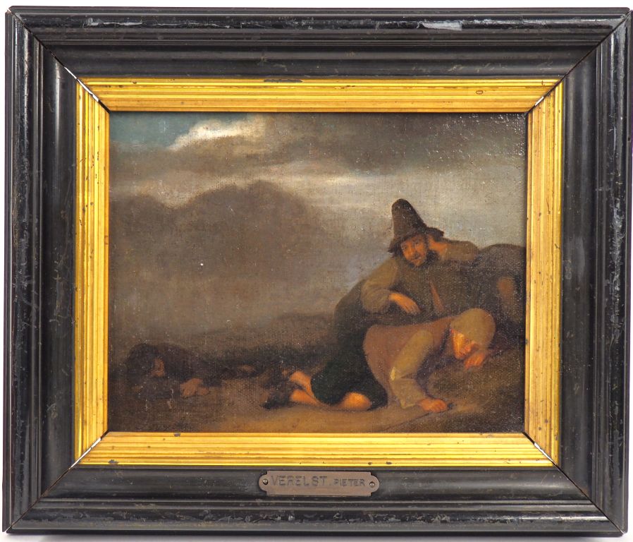 Pieter Hermansz VERELST (Dordrecht 1608 - 1675) "Repos de paysans" Toile marouflée sur panneau de chêne Hauteur : 18,5 cm Largeur : 22,6 cm Signé en bas à gauche P.Verelst. Expert : Cabinet Turquin - Stéphane Pinta 01.47.03.48.78