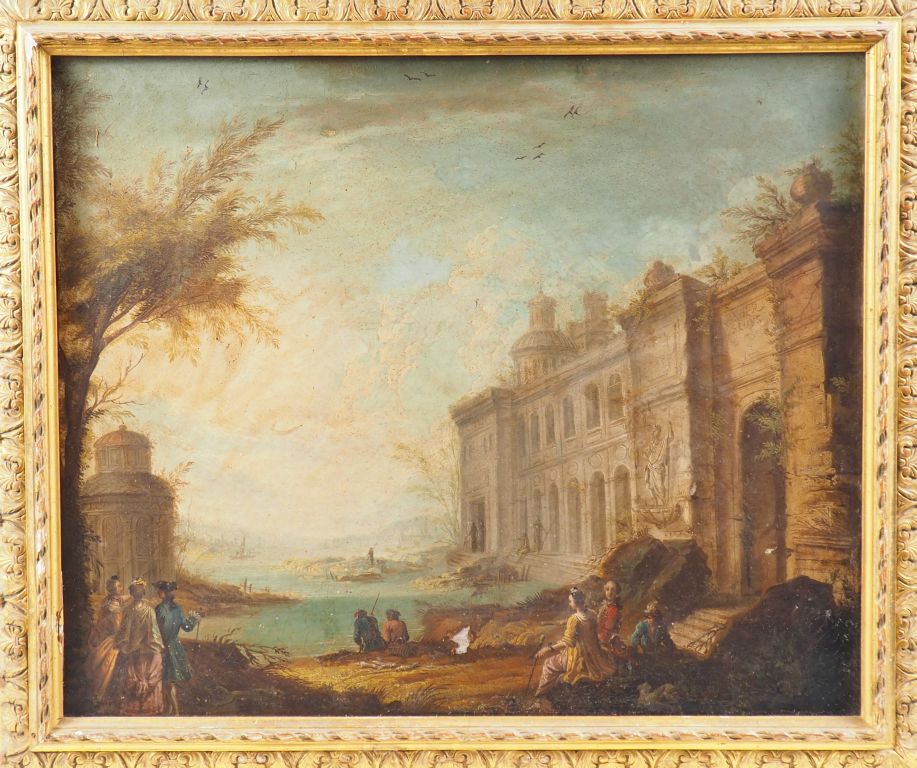 VAN DER SLUYS. "Port animé dans un paysage d'architecture". Huile sur toile signée. Dim. 46 x 55 (Sauts de peinture).