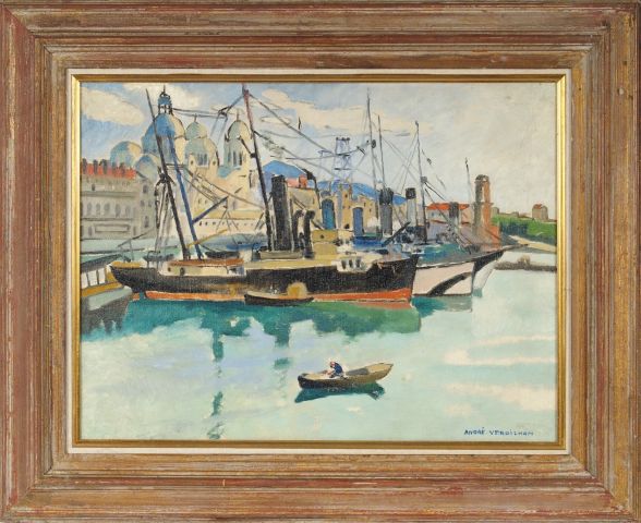André VERDILHAN "Le port de Marseille". Huile sur toile, signée en bas à droite. 46 x 61 cm