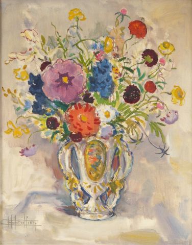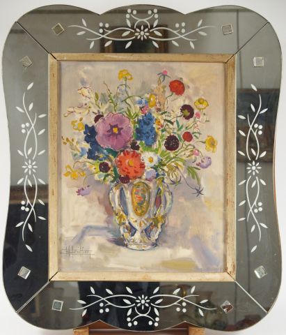E. BOUILLIERES, "Bouquet de fleurs dans un vase". Huile sur toile, signée en bas à gauche dans un joli cadre en verre gravé. Dim. : 48 x 39 cm.