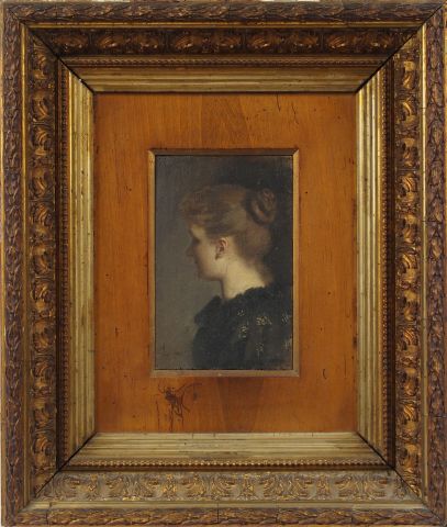 Ecole française XIXème 'portrait de jeune femme au chignon'. Huile sur panneau signée en bas à gauche. 23 x 16 cm.