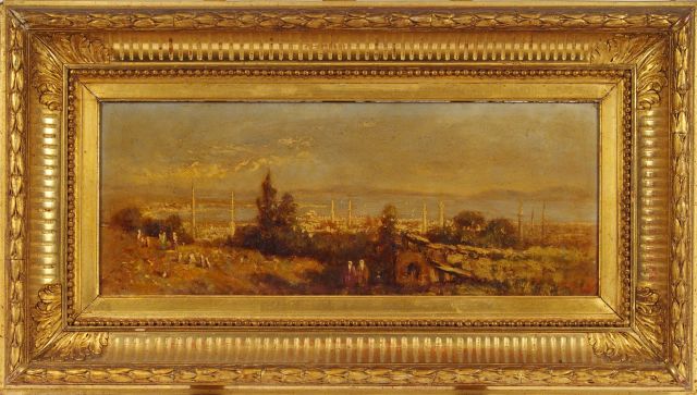 Ecole orientaliste XIXe, "Paysage et ville portuaire d'Afrique du Nord". Huile sur panneau. Dim. : 20 x 50,5 cm .