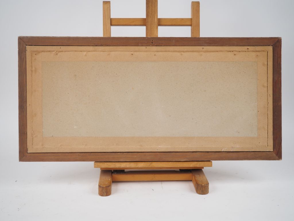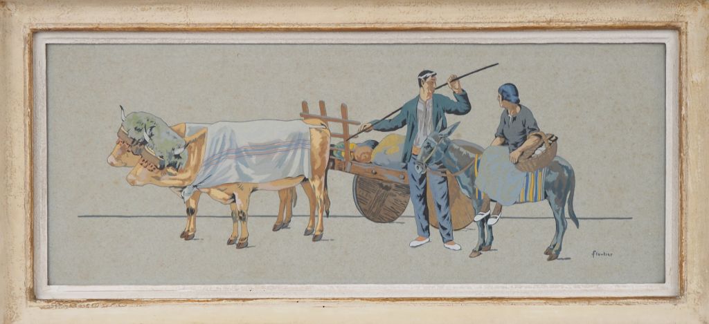 FLOUTIER. "paysans basques et leur paire de boeufs". Pochoir, signé en bas à droite Dim. 24 x 61,5 cm