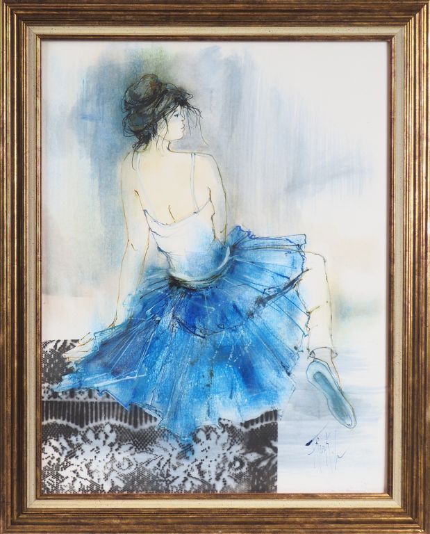 FRANCK L. "Danseuse au tutu bleu". Aquarelle sur papier, signée en bas à droite. Dim. à vue 64 x 49 cm.