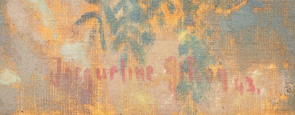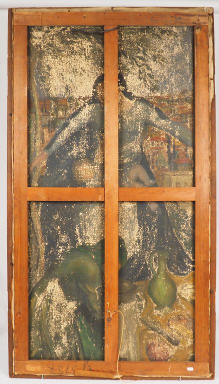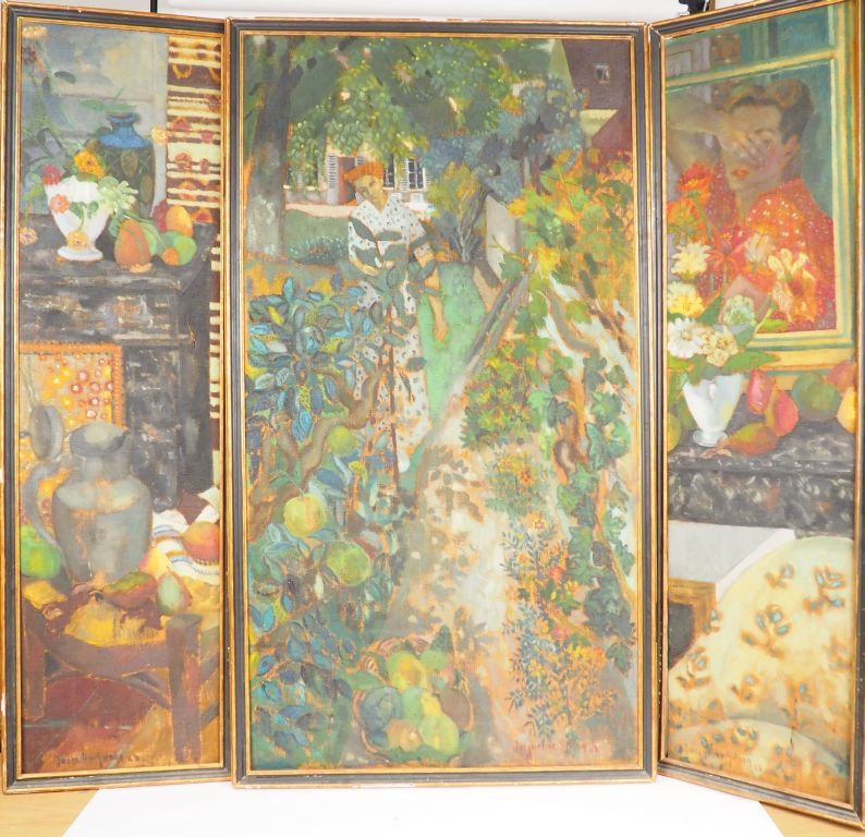 Jacqueline GILSON. Tryptique « Femme au jardin" et "natures mortes" Huiles sur toiles. Signées et datées 43. Dim. panneau central : 157 x 84 cm Panneaux latéraux : 157 x 42 cm