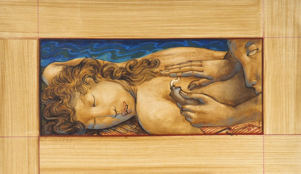 Jean-Pierre CEYTAIRE. "Massage". Huile sur toile, signée en bas à droite et datée 97. Dim. 44 x 75 cm.