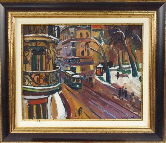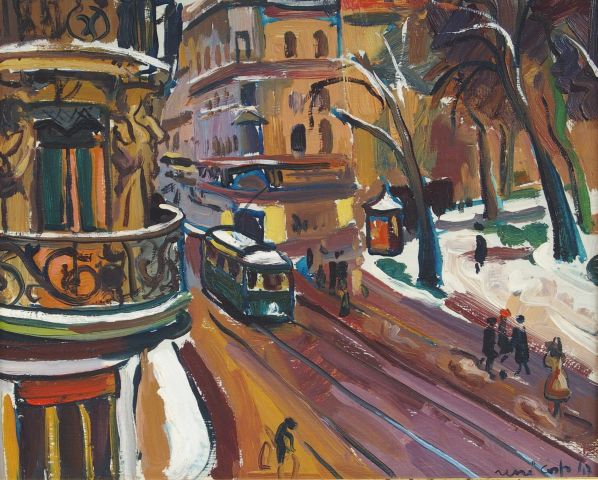 RENEE ASPE, "Toulouse, jour de neige". Huile sur carton signée en bas à droite et datée 47. Dim. : 32 x 40 cm.