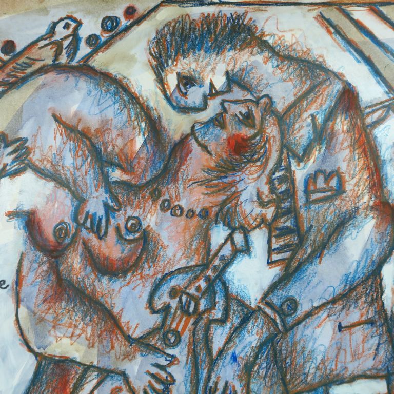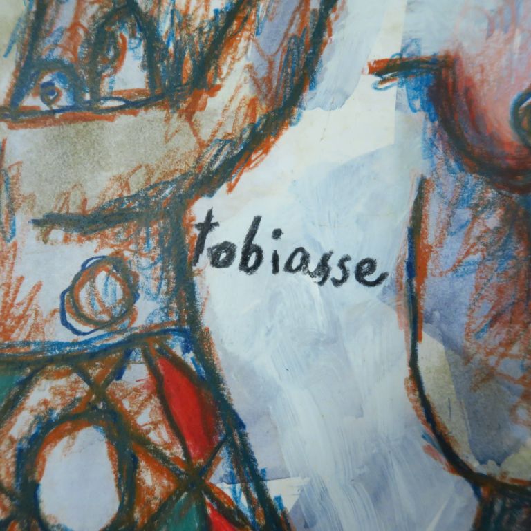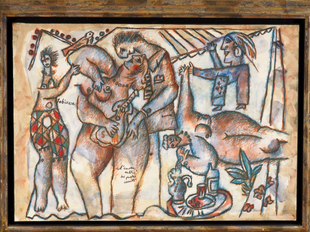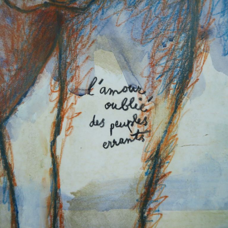 T. TOBIASSE."L'amour oublié des peuples errants". Technique mixte sur papier, signée. Dim. : 70 x 102 cm. Certificat de Théo Tobiasse.
