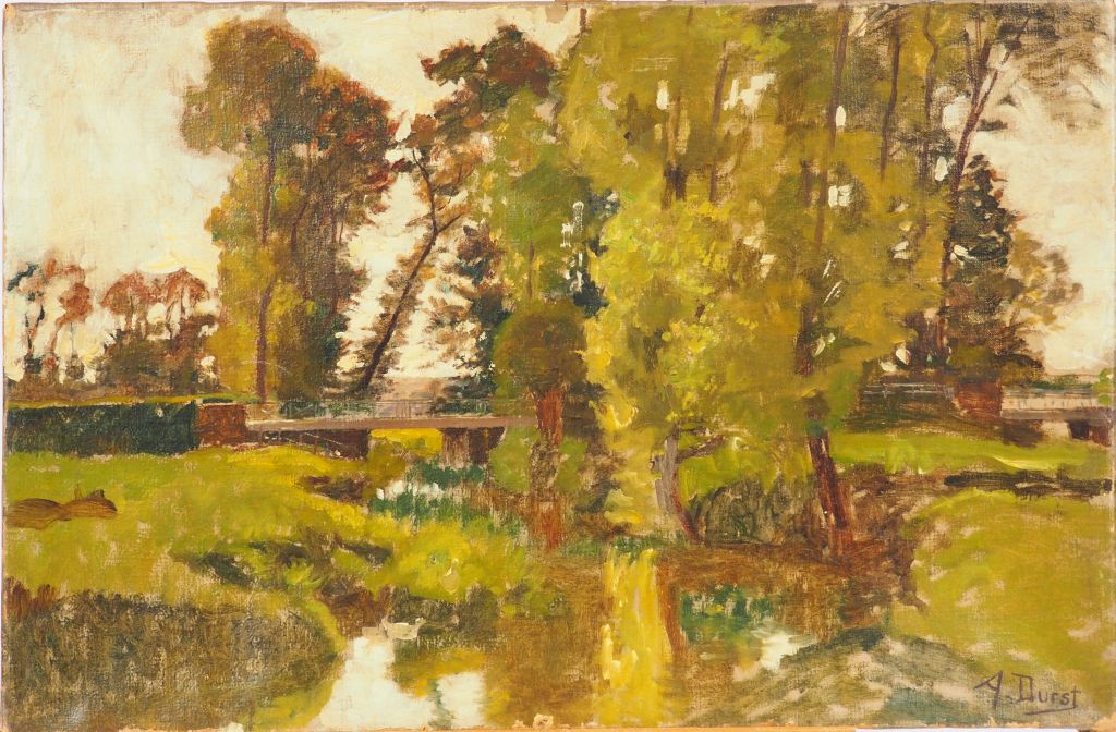 A. DURST. "Paysage au pont". Huile sur toile. Signée en bas à droite. Dim : 44 x 67 cm.