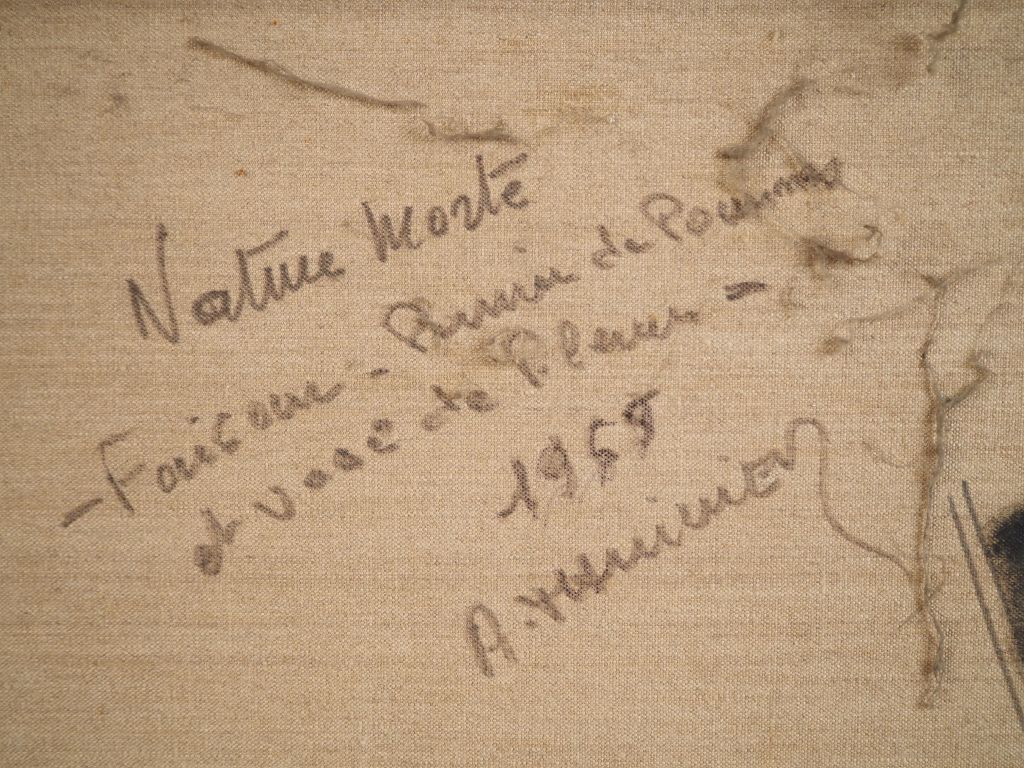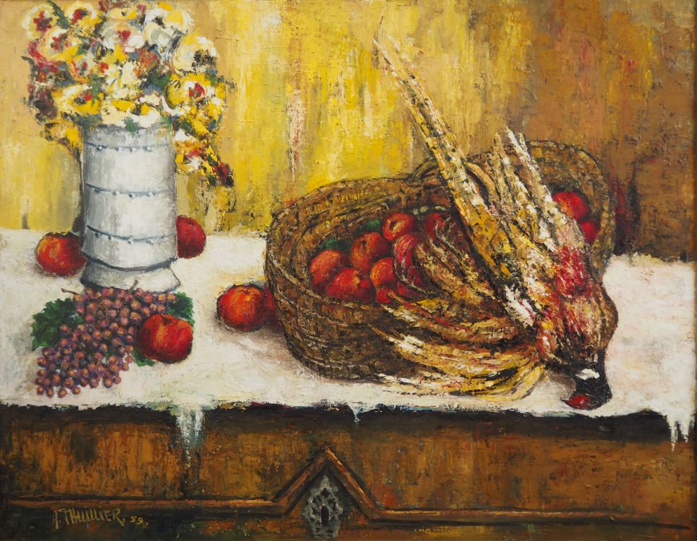 A. THUILLIER. Grande nature morte, signée en bas à gauche et datée 59 Dim. 114,5 x 147 cm