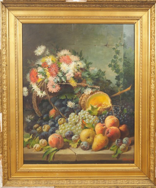 A. TRINQUIER. "natures mortes" Paire d'huiles sur toile, une signée en bas à droite. Dans leur cadre d'origine en mauvais état Dim. 81 x 65,5 cm (accidents)