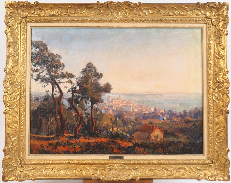 Abel LAUVRAY. "Antibes, derrière les pins". Huile sur toile, signée en bas à gauche et dans un cartouche, titrée au dos. Dim. 60 x 81 cm. (Restaurations).