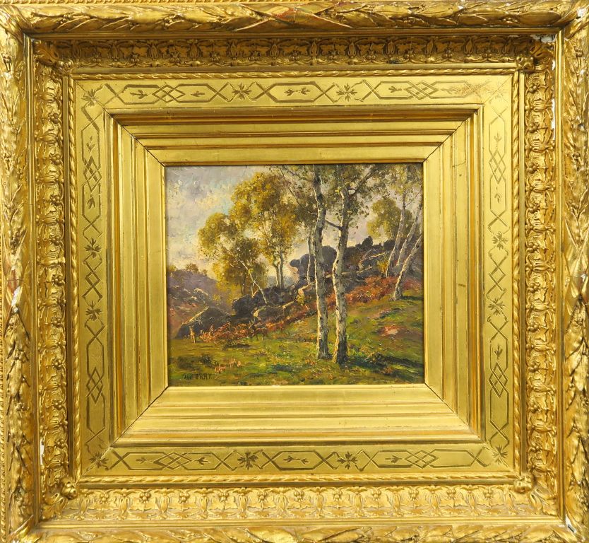 Abel ORRY "Paysage" Huile sur panneau. Signée en bas à gauche. Dans un cadre en bois et stuc doré (petits sauts). 19 x 22 cm