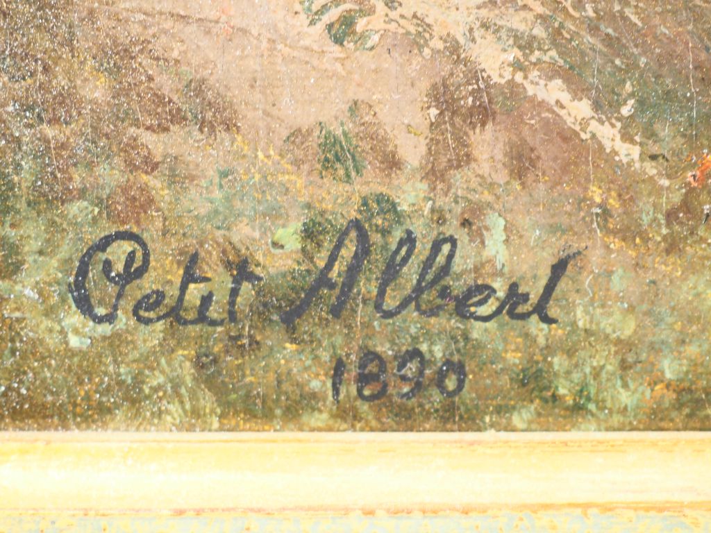 Albert PETIT. "La cueillette". Huile sur toile marouflée sur panneau, signée et datée en bas à droite 1890. Dim. 34 x 50 cm.