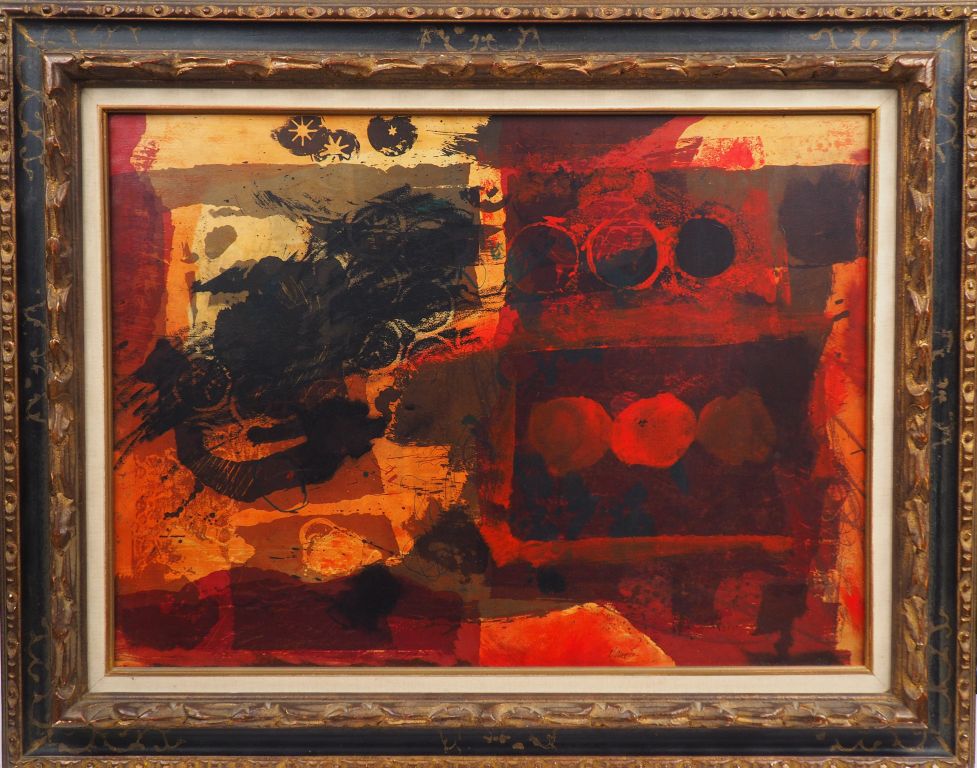 Antoni CLAVÉ "Nature morte sur fond rouge" Huile sur papier marouflée sur toile. Signée. 56 x 76 cm Avec certificat d'authenticité provenant de la Galerie de la Présidence à Paris.