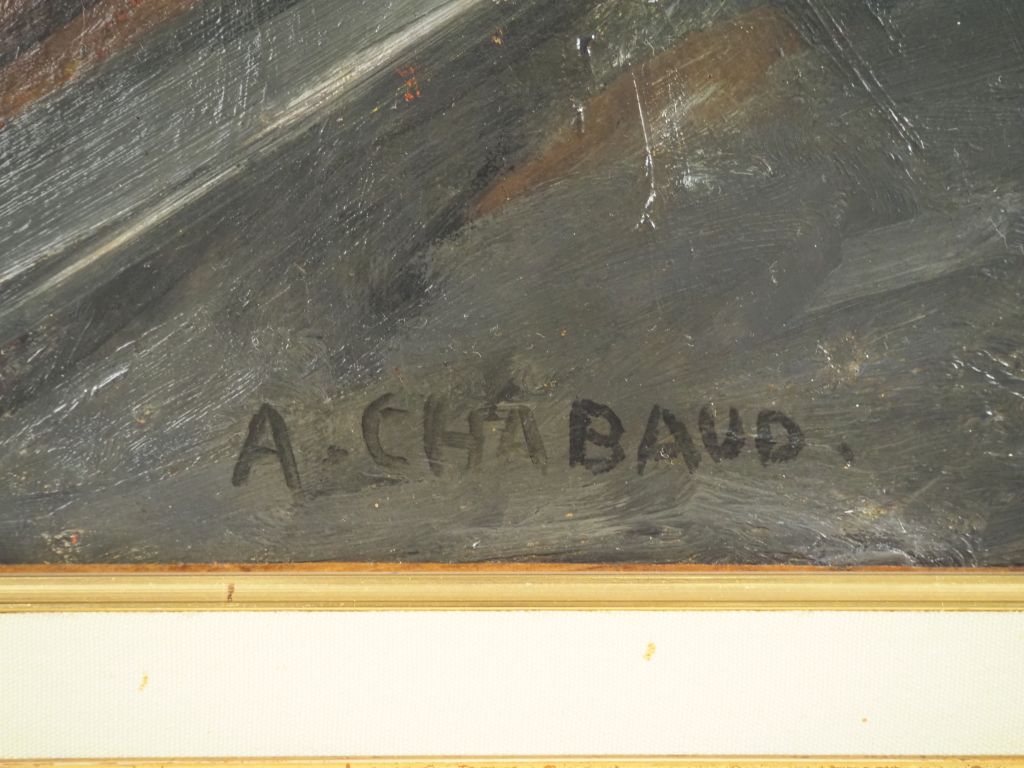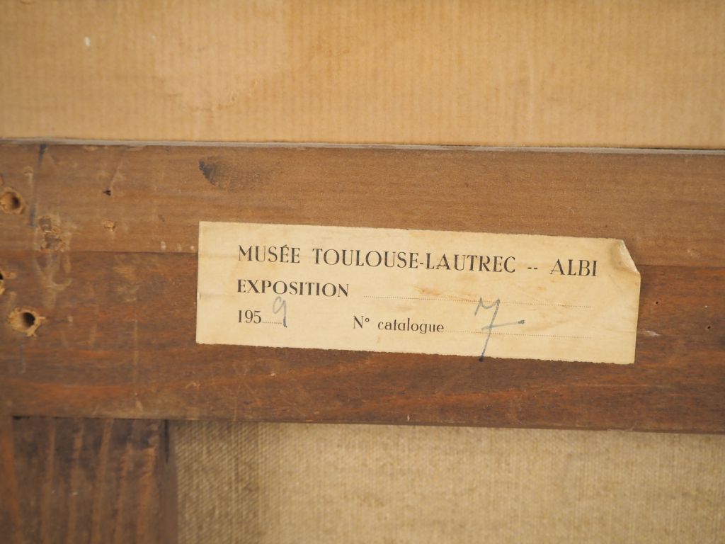 Auguste CHABAUD (1882-1955) « Femme en bleu au comptoir », 1909 Huile sur carton marouflé sur toile. Signée en bas au centre. (restauration) Dim. 58 x 79 cm Bibliographie : Auguste Chabaud, par Maximilien Gauthier, Editions Les Gémeaux, Paris, 1952, illustré sous le n° 9. Exposition : -Paris, Cercle Artistique et Littéraire de Volney, « 50 ans de peinture » juin-juillet 1952, n° 38. (Etiquette au dos) -Nîmes, Exposition rétrospective A.Chabaud, juillet-septembre 1956 -Musée des Beaux-Arts de Metz, 1958. -Musée des Beaux-Arts de Nancy, 1958. -Musée Toulouse Lautrec d’Albi, « Chabaud, Seyssaud et Verdilhan », 1959, n°7. (Etiquette au dos) -Galerie Tony Spinazzola, Aix-en-Provence,1960. -Musée Asashi Shimbum, Japon, « Les Fauves », 1965. -Musée Kanazawa et Musée Ishikawa, Tokyo, Japon, « Les Fauves au Japon » ,1974. -Musée des Beaux-Arts d’Hiroshima et Musée Otani des Beaux-Arts, Nishinomiya et Musée de Tukushima, Japon « Matisse et ses amis » du 10 avril au 5 mai, 1981 Provenance : Collection particulière Monsieur R (Toulouse) Après son service militaire effectué en Tunisie (1903-1906), le peintre provençal Auguste Chabaud, paysan agriculteur à Graveson, monte à Paris, s'installe à Montmartre et fréquente bientôt l'avant-garde picturale parisienne, notamment celle qui vit au Bateau-lavoir (Picasso et Van Dongen). C'est ce dernier qui a exposé avec les fauves au Salon d'automne qui marque fortement le peintre provençal ( vie sociale parisienne, vivacité des couleurs, dessin agressif cernés de lourds traits noirs). Chabaud expose aux Indépendants et au Salon d'automne. Il peint des tableaux qui illustrent sa fascination pour la vie mondaine, les soupers fins, les cafés élégants, les palaces mais aussi pour la nuit parisienne, ses maisons-closes et les filles de mauvaise vie . Notre Tableau est un chef-d'œuvre de 1909 du fauvisme de Chabaud : couleurs très hautes, dessin anguleux et agressif, perspective heurtée, contraste de noirs et de blancs très lumineux. Experts : Frédérick et Pauline Chanoit - 01 47 70 22 33