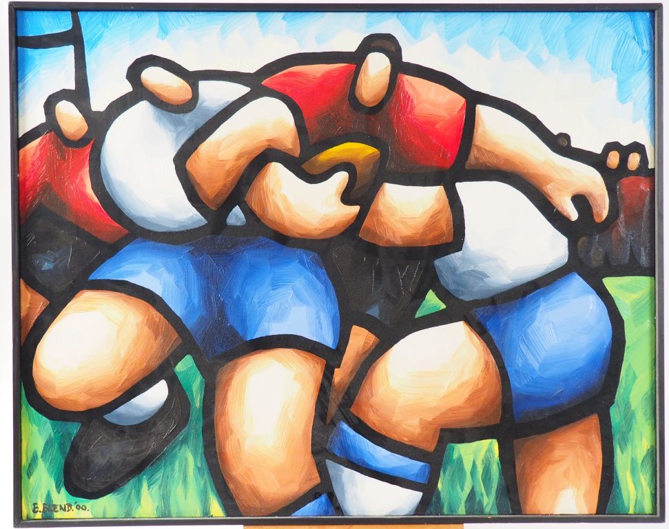 B. BLEND "La partie de rugby" Huile sur toile. Signée en bas à gauche....
