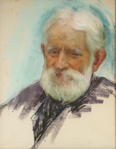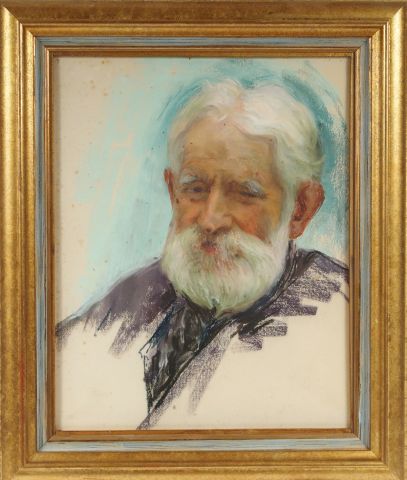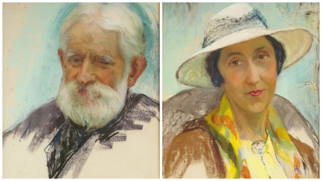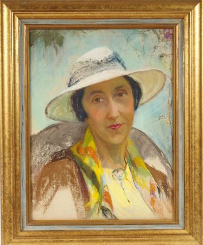 Berthe HAINAUT "Portrait d'homme et d'élégante au chapeau". Paire de pastels. 44 x 35 cm.