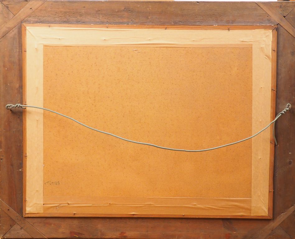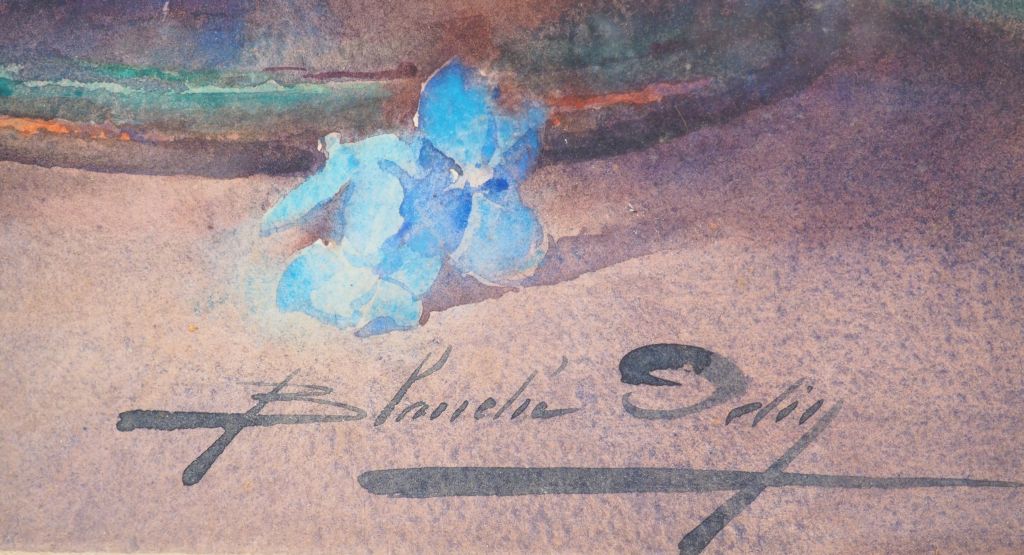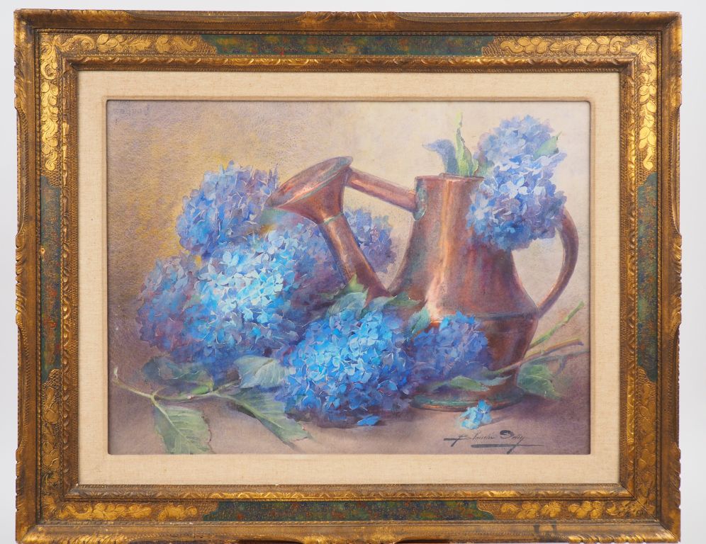 Blanche ODIN. 'Hortensias bleus et arrosoir en cuivre rouge'. Aquarelle, signée en bas à droite. Dans son cadre d'origine. Dim. : 54 x 73 cm.