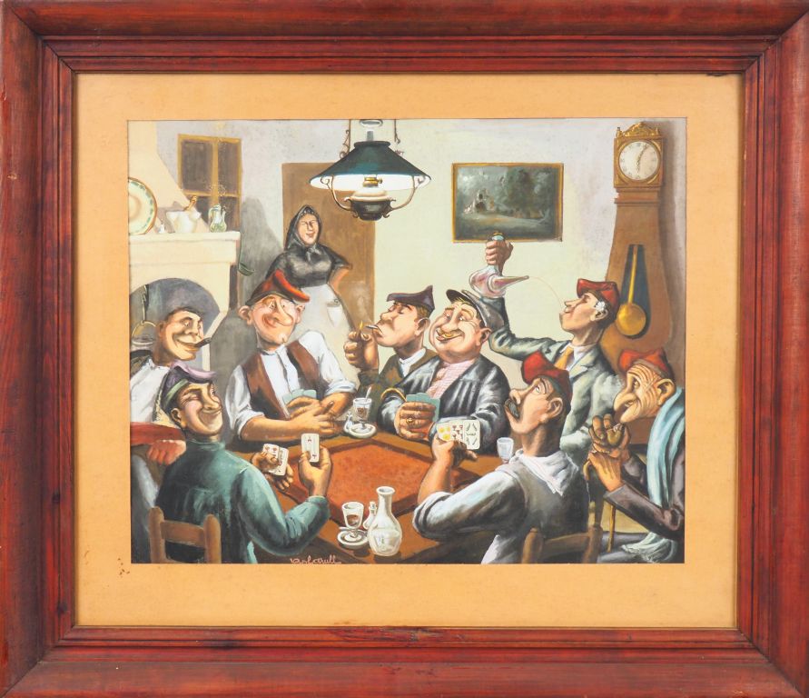 BOFAROULL. "Les tricheurs". Gouache, signée en bas à gauche. Dim. 39,5 x 50 cm.