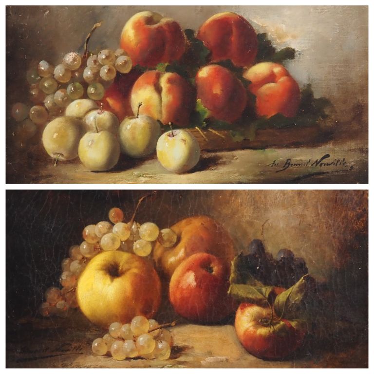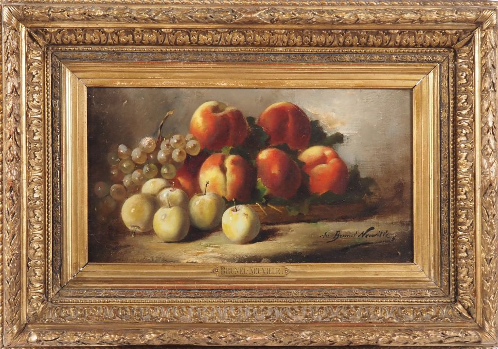 BRUNEL de NEUVILLE. "natures mortes" Paire d'huiles sur toiles, signées en bas à gauche et à droite Dim. 22 x 40 cm (petites restaurations) dans leur cadre d'origine en stuc doré