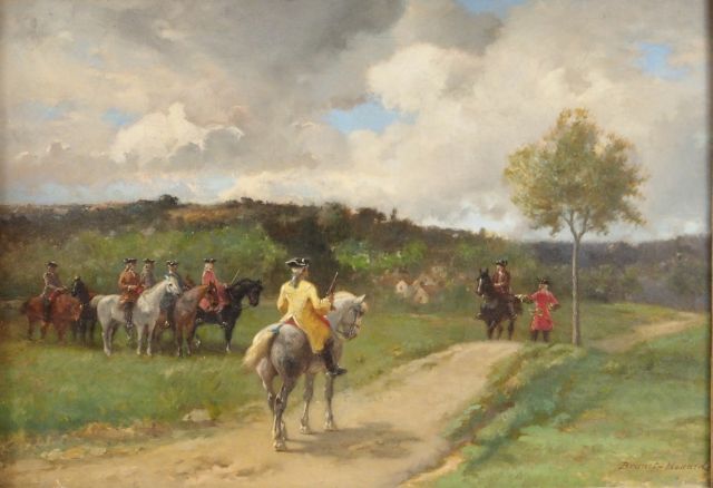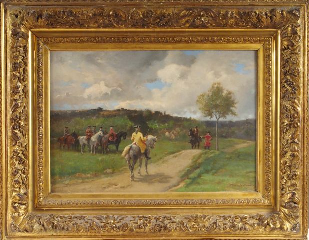 BRUNET-HOUARD "Scène de chasse à courre". Huile sur toile. Signée en bas à droite. 38 x 55 cm