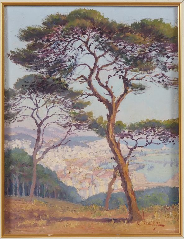 Camille Adolphe LAURENS. "Village de bord de mer". Huile sur panneau, signée en bas à droite. Dim. 35 x 28 cm.