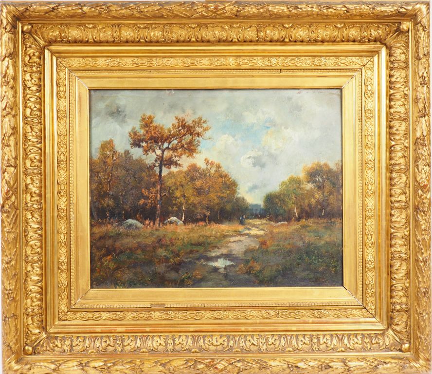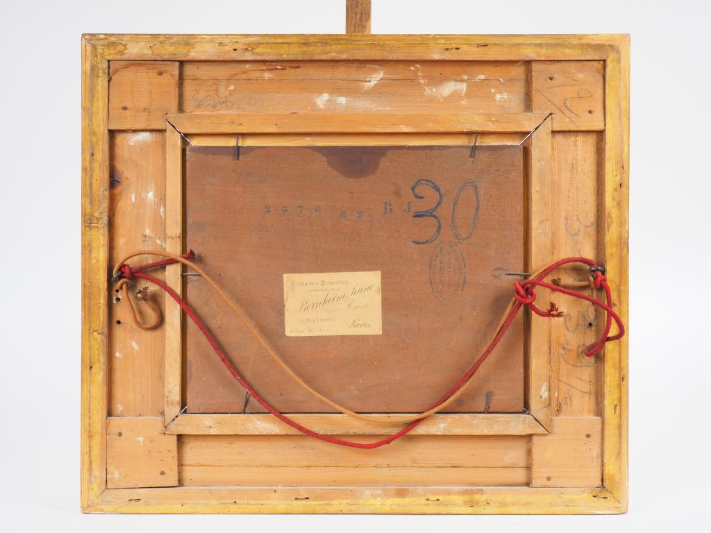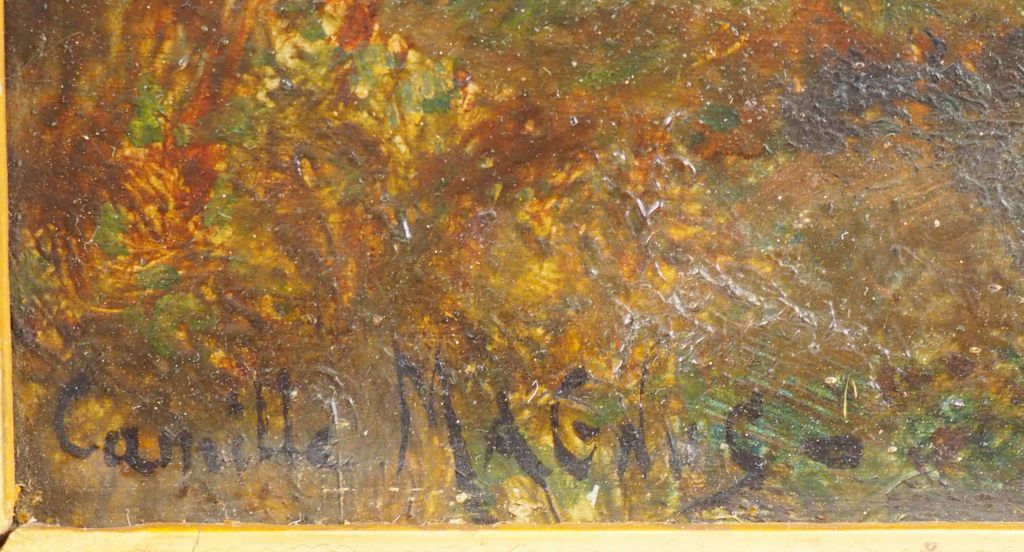 Camille MAGNUS. 'Paysanne cheminant'. Huile sur panneau. Signée en bas à gauche. Dans un cadre en bois et stuc doré. Dim. : 31 x 39.5 cm.
