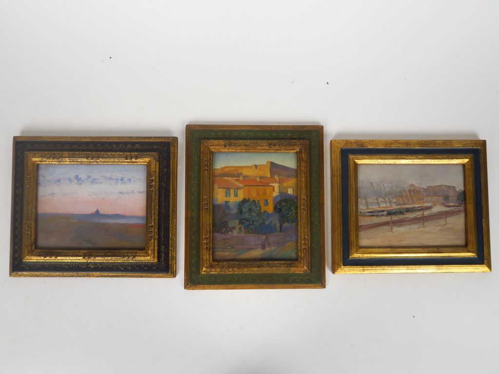 Cécile Patrice BONNET "Le retour des champs", "Port de plaisance" et "Paysage" Trois huiles sur panneau. Non signées. 18 x 14 cm et 14 x 18 cm