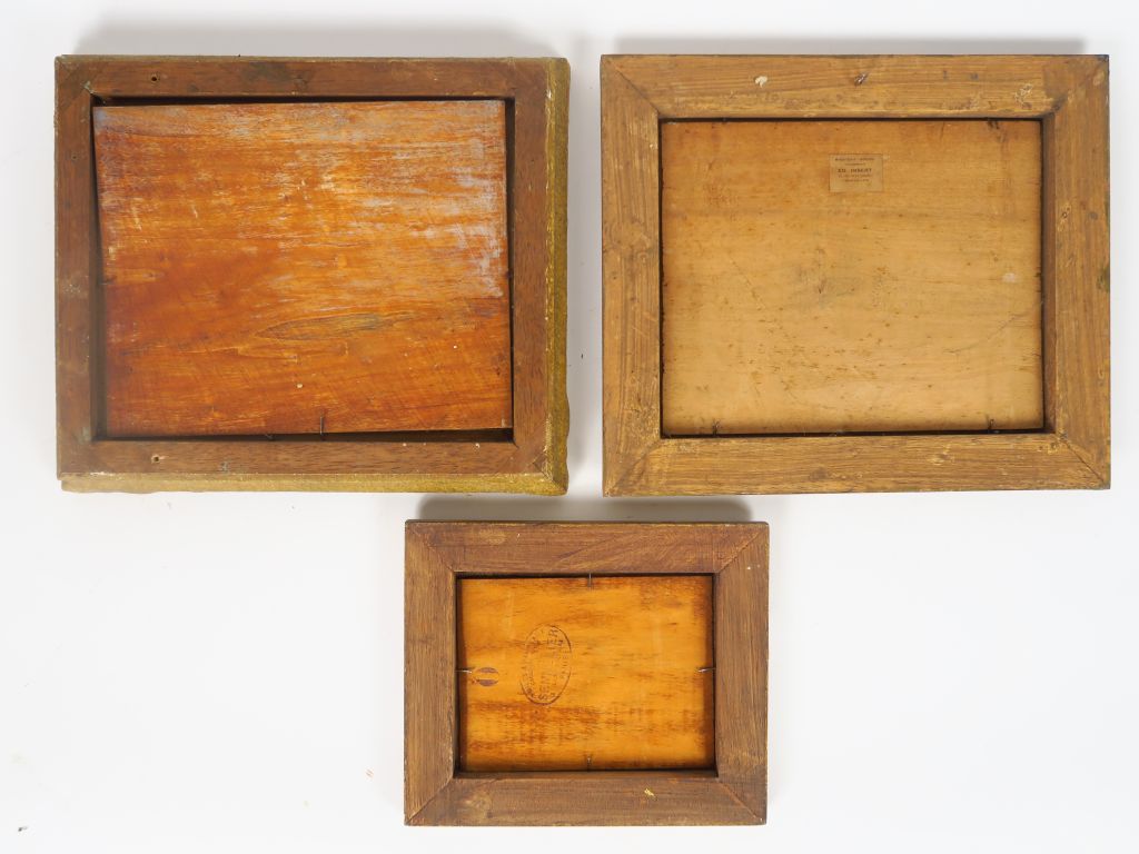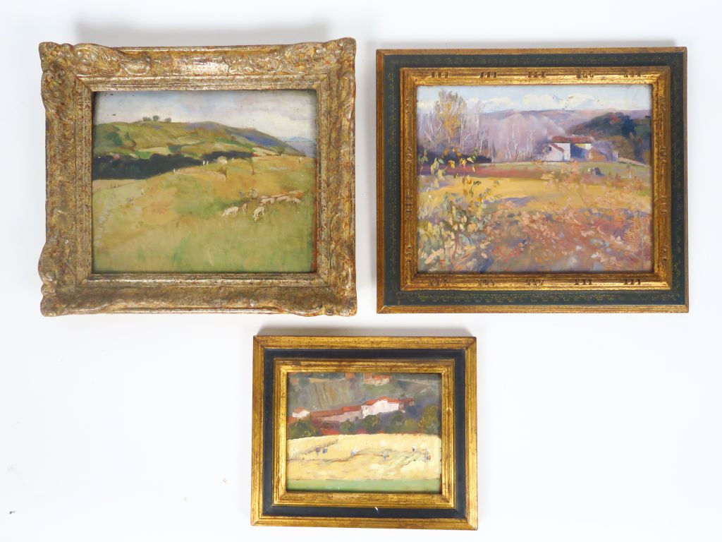 Cécile Patrice BONNET "Paysages animés" Trois huiles sur panneau. Non signées. 21,5 x 27 cm et 13,5 x 18 cm